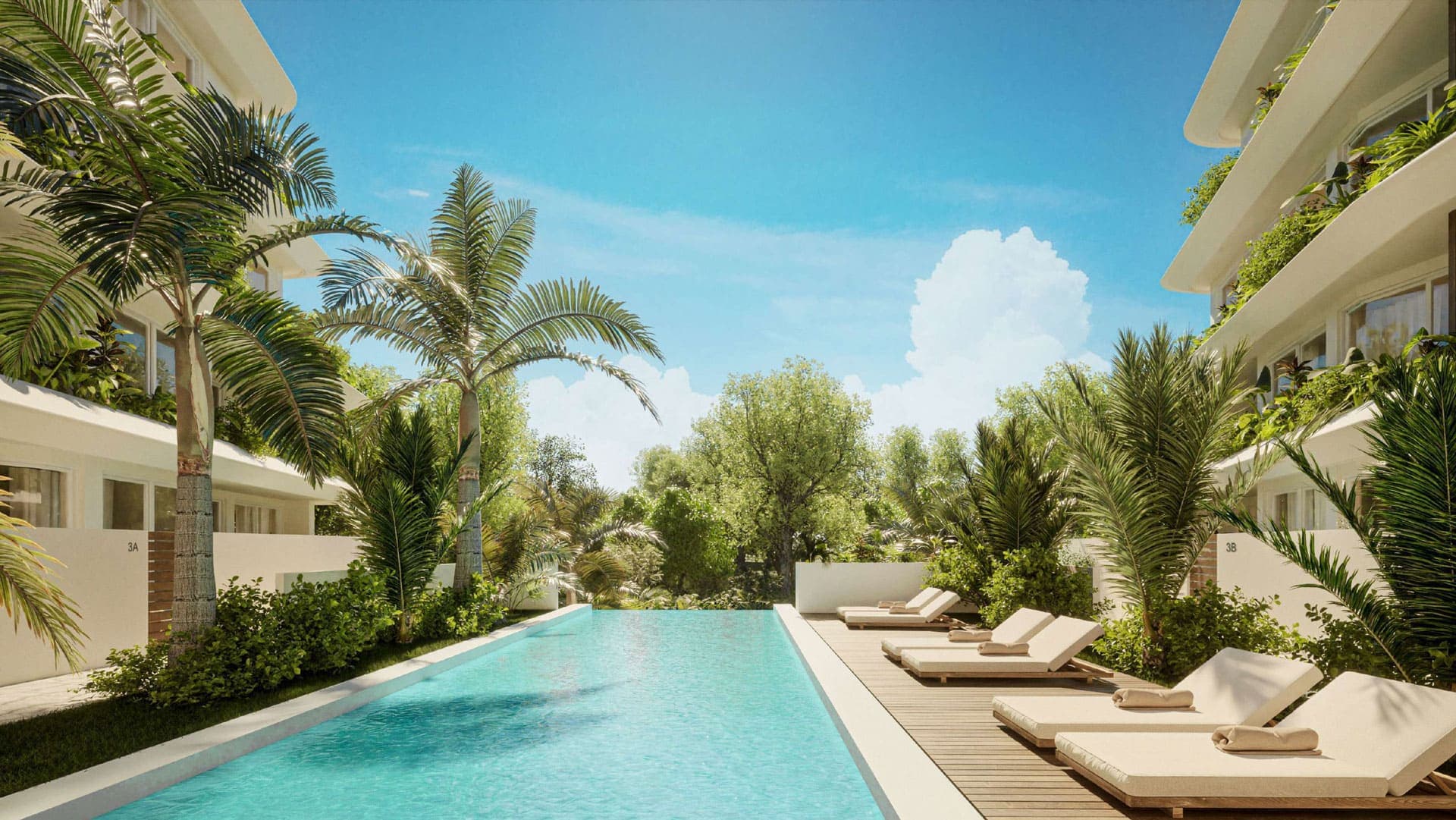 Escape to our serene pool oasis. Surrounded by greenery, it's perfect for swimming, sunbathing, and relaxation, providing a peaceful retreat within our complex.